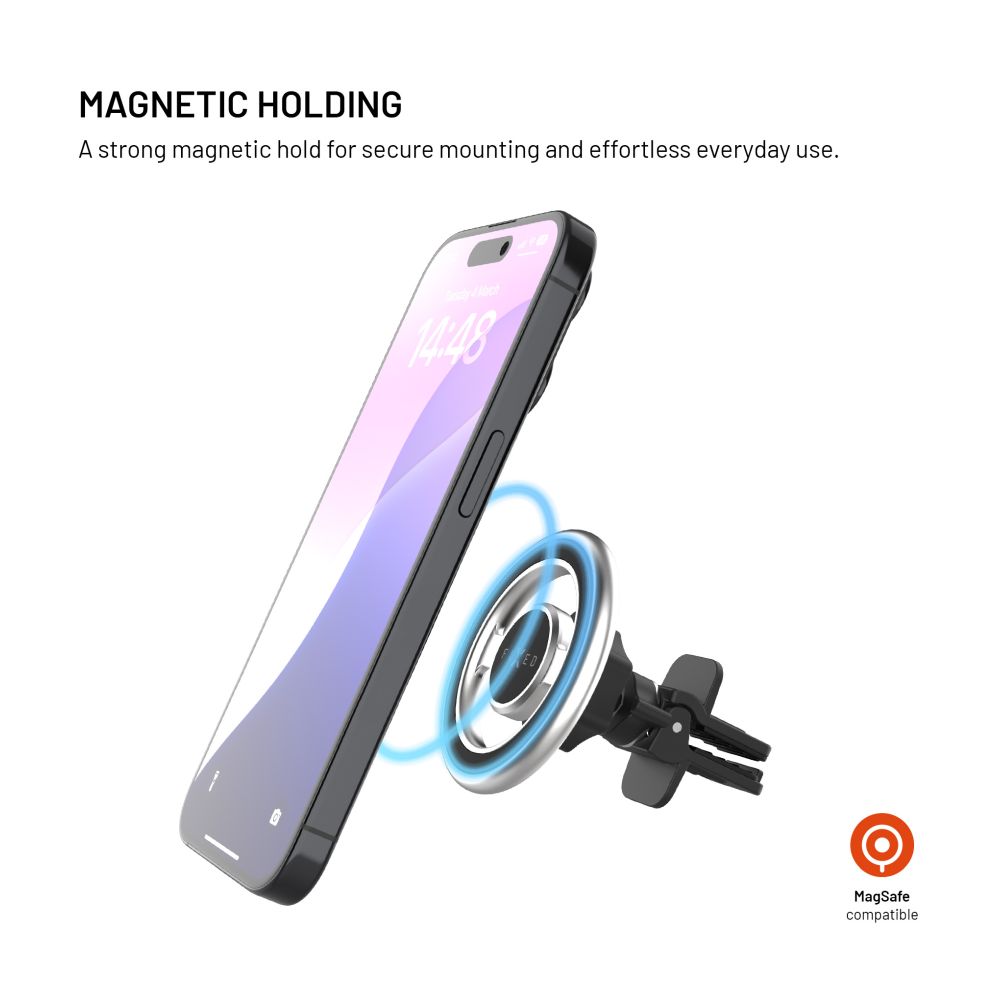 FIXED MagMount je magnetický držiak do ventilácie auta, ktorý je navrhnutý priamo pre iPhony s funkciou MagSafe. Je určený na uchytenie do mriežky ventilácie, uťahovacie kliešte na zadnej časti držiaka sú vybavené istiacim háčikom pre perfektnú stabilitu. Držiak MagMount funguje na jednoduchom a efektívnom princípe, po obvode držiaka je inštalovaných 18 magnetov, jednou rukou stačí priložiť telefón k držiaku a ten sa pevne uchytí k jeho základni. Pokiaľ máte starší iPhone alebo iný telefón bez funkcie MagSafe, v balení nájdete špeciálnu magnetickú podložku, vďaka ktorej vybavíte váš telefón na použitie s držiakom MagMount. Držiak spoľahlivo udrží telefón bez ohľadu na otrasy spôsobené jazdou a umožní vám bezpečne a pohodlne používať navigáciu alebo vybaviť hovor. Pomocou otočného kĺbu si nastavíte telefón do ideálneho pozorovacieho uhla tak, aby bol neustále na očiach. Decentný dizajn perfektne zapadne do interiéru akéhokoľvek vozidla.